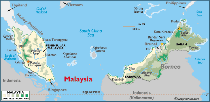 Malaysia is divided into West Malaysia( Peninsular Malaysia) and East Malaysia (Sabah and Sarawak) which is also part of the island of Borneo (Source: World Atlas)