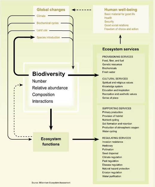 Diagram from the Millennium Ecosystem Assessment showing relationships between biodiversity, ecosystem services and human well-being.