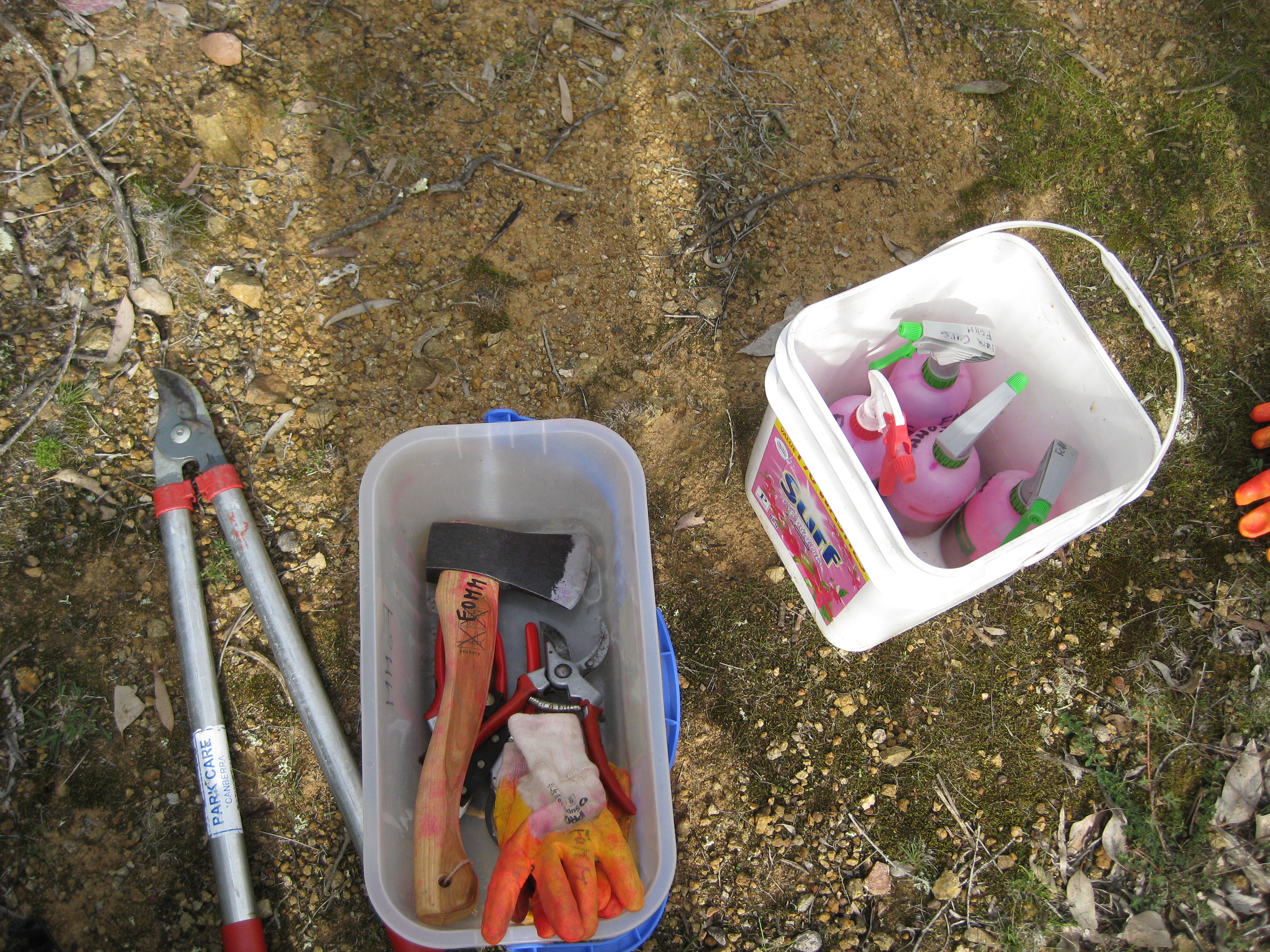 clippings dumped in the middle of the bush. Small Cootamundra and other weeds can be dealt with using shears; however some larger individuals have to be ringbarked, except that the axe cuts are sprayed with herbicide which the plant absorbs when it retrieves the sap, poisoning itself.