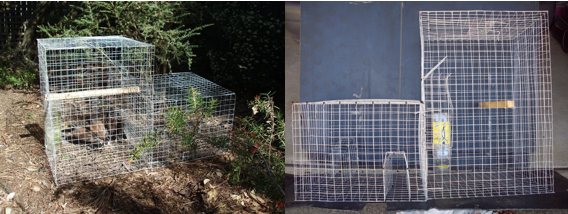 Indian Myna Traps – birds are enticed into the traps with food and cannot escape back through the chute.