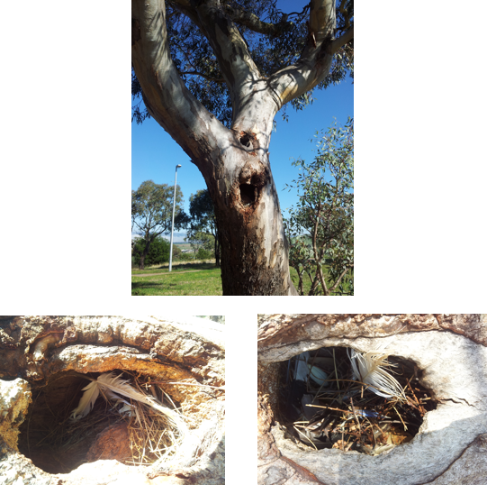 Original photos of natural (tree hollows) and artificial (structure – e.g. in roofs) Indian Myna refugial nest sites in Belconnen.