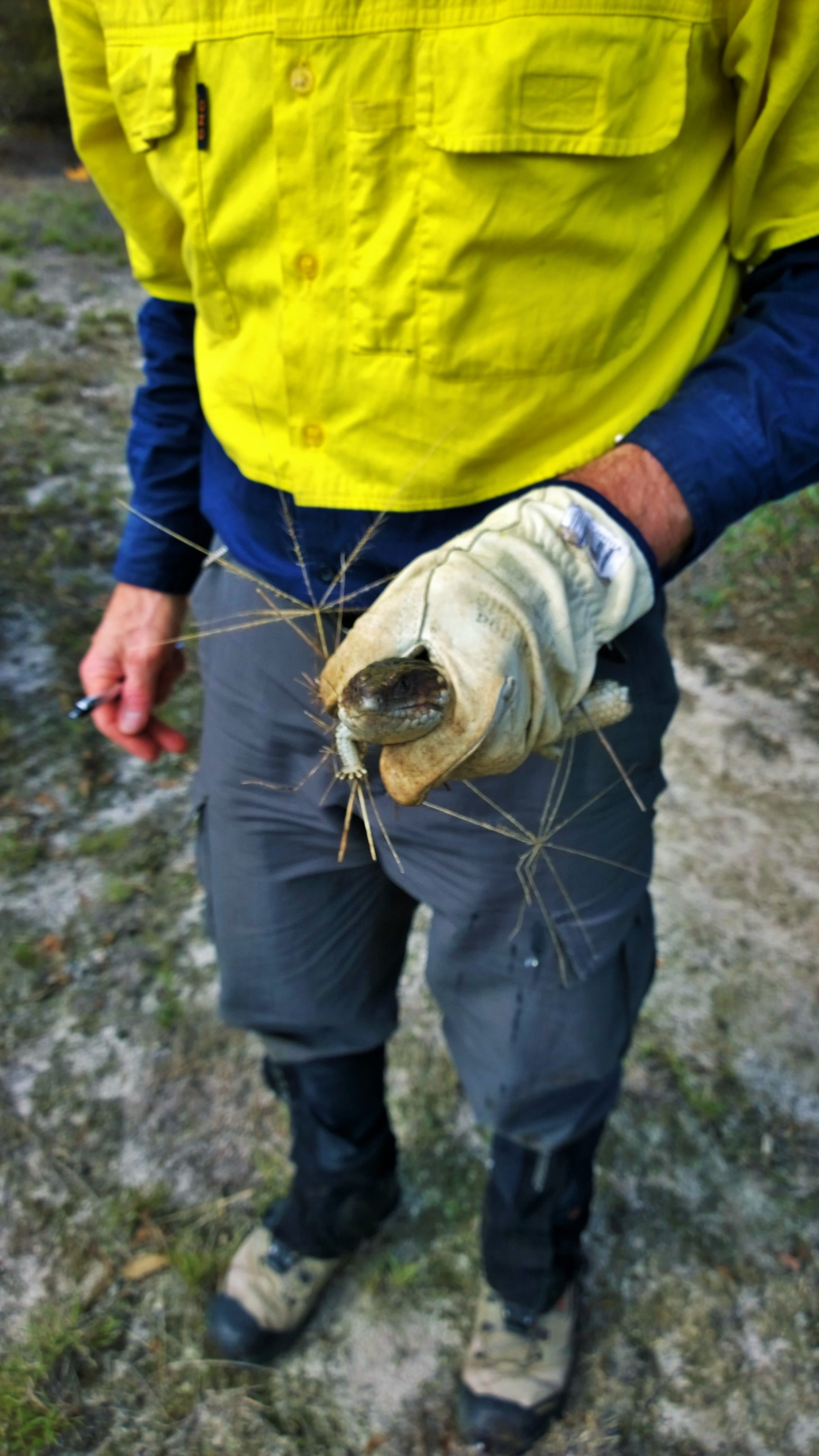A temporarily unhappy, but mostly grateful-for-his-new-woodland Shingleback Lizard