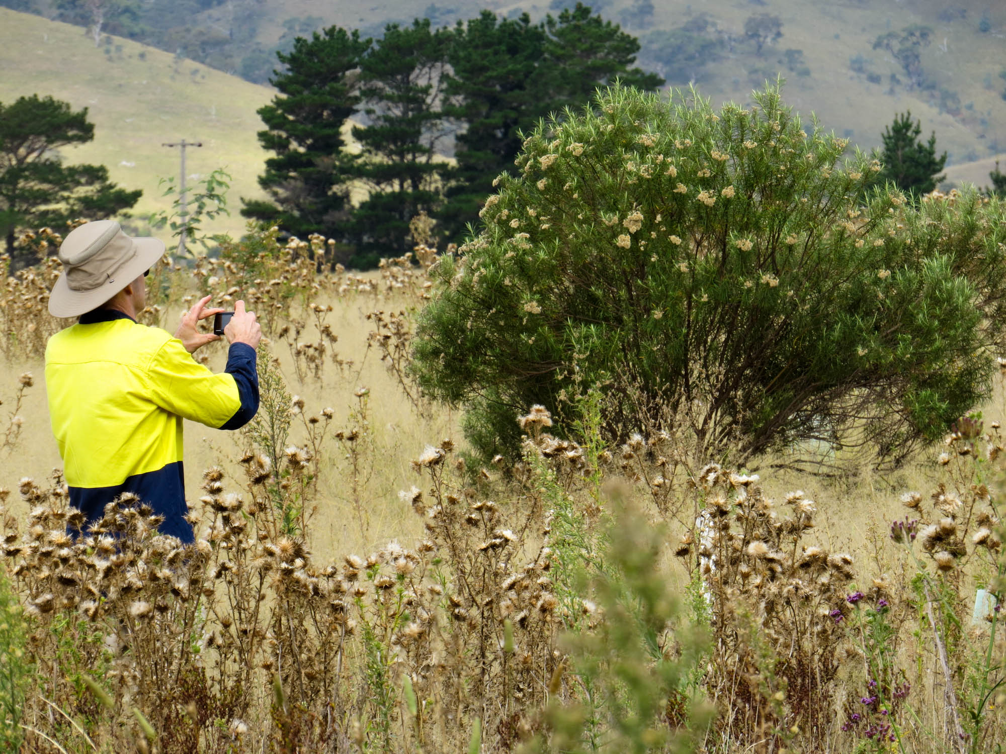In past years, batches of students and volunteers have planted saplings and seedlings upon rows within the 300ha site by hand or direct seeder machines. Our role was to check on these saplings from Eucalyptus, Acacia, Cassinia and Bursaria genera, categorising these plantings according to soil type, genus/species and health. Some rows had differing treatment (weed mats), while others had specified patterns of species planted along the row. From our data collection exercise, we were able to confirm low plant mortality rates (less than 4%) over two years.