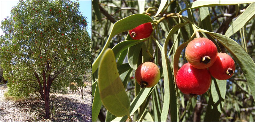 The quandong tree is a hemi-parasite, meaning it relies on the roots of a host plant to obtain nutrients but is also capable of photosynthesising. Its characteristic red fruits are edible and sweet, and often used for making jam (Photo credit: Aus-e-made).