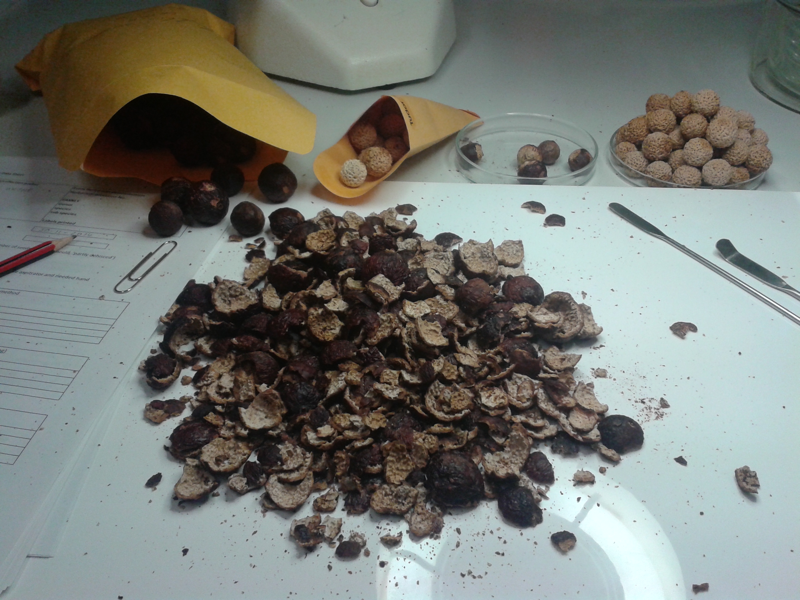 Photographs of the seeds, with and without fruits, were taken for National Seed Bank records, and to showcase the variation in seed form produced by each of the parent trees (Photo credit: T. North, National Seed Bank).