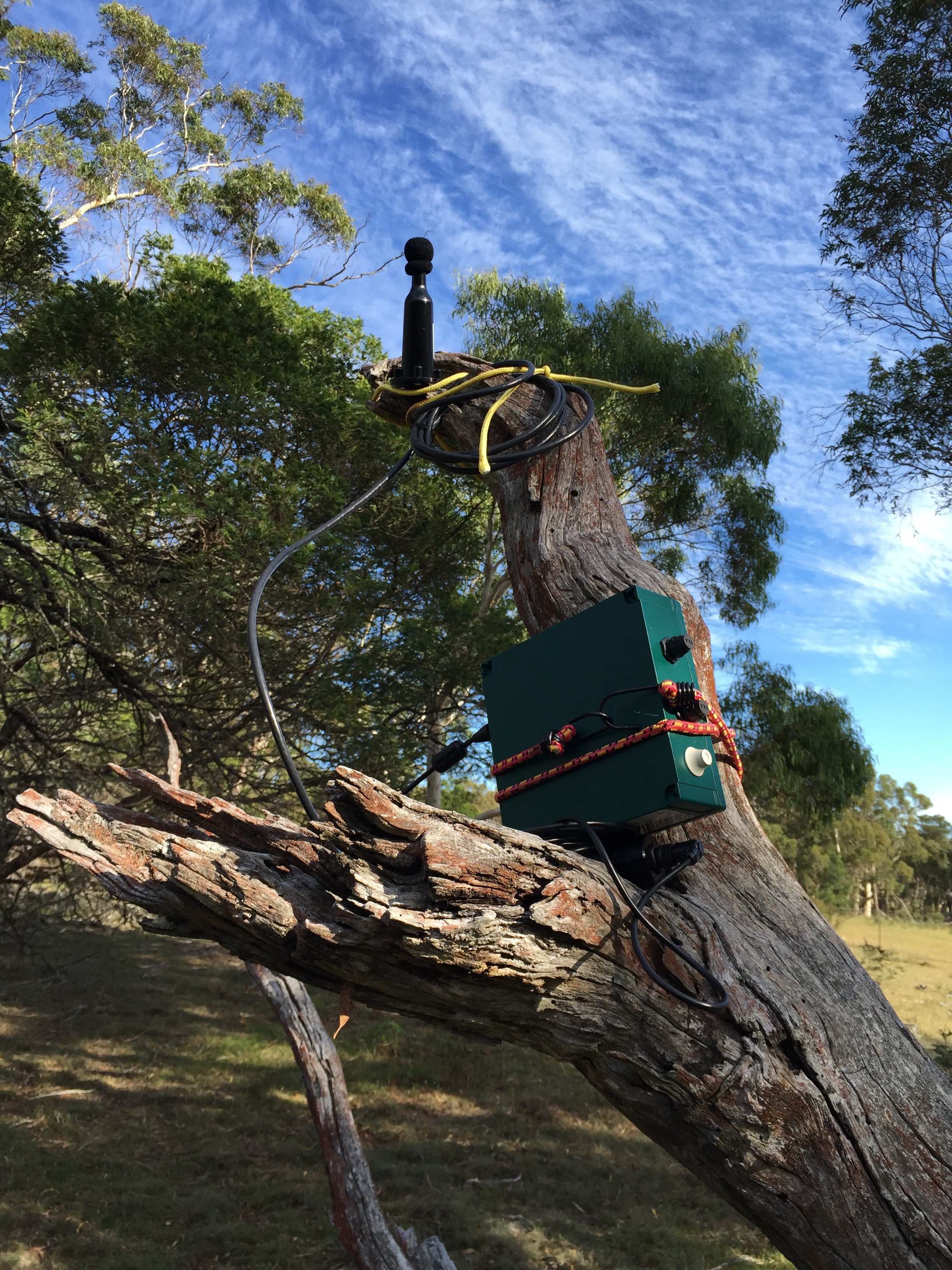 That is done in order to count the population as they leave to the coast. So Doug goes there a few times to check the numbers that are gone and the ones that are left to compare those numbers across the years and follow the development of that population. Another part of the work is to find out probable routes that those bats choose, and to do that Doug Mills installed some ultrasonic detectors around Bungendore and, as part of my work experience we went there to collect them. Figure 3 The ultrasonic detectors are placed on high places so it it easier to detect any noise.