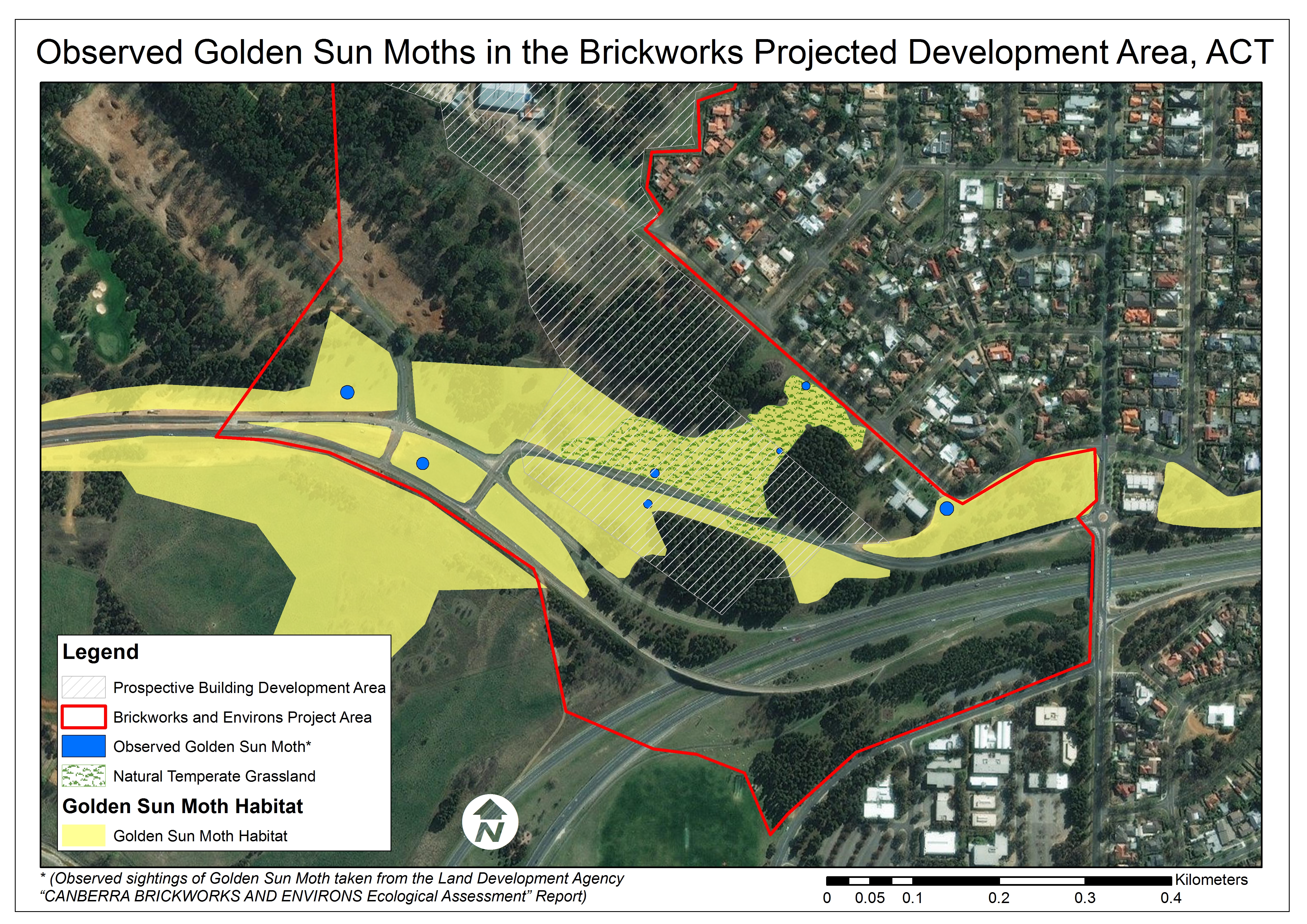 I expressed to Larry that my strengths lie in data manipulation. I was then assigned to work along fellow student Brittany on spatially examining the controversial planned redevelopment of the Yarralumla Brickworks, and its impacts on the threatened Golden Sun Moth (GSM) and its native habitat, Natural Temperate Grassland (NTG). NTG is the most endangered of vegetation types in Australia, as less than 1% of its pre-European extent remains.