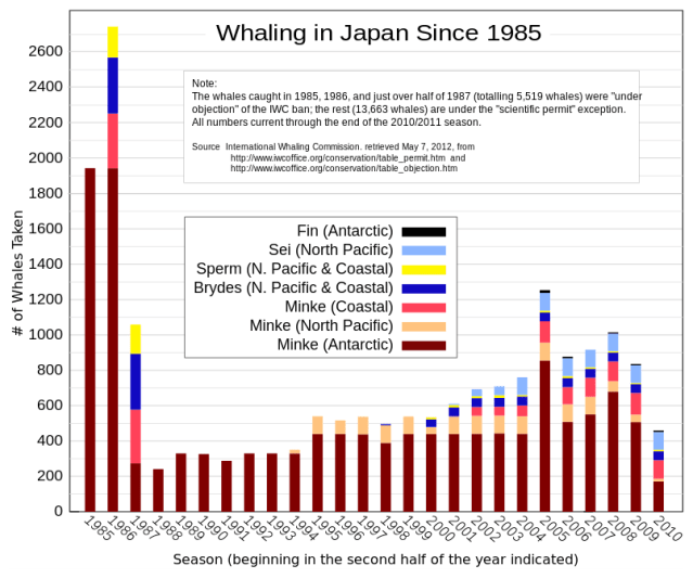 Chart 1: this chart indicated the species and number of whales killed by Japan since 1985. The number boosted in 1986 like the last frenzy. (Source: data from http://www.iwcoffice.org; modified by Grolltech)