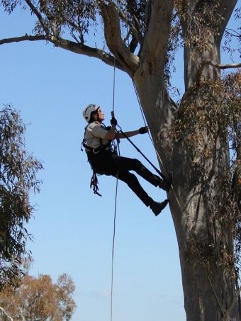 Dr Rayner climbing a tree. (ABC News: Craig Allen)