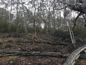 After a quick target identifications session, they’re off working in small groups they tackle the wattles. I am on the chainsaw (the only one other than Marty with appropriate training in its operation), moving between groups helping with larger weeds. The cadets move quickly across the slope and reach a gully marking the end of the target area, before turning back uphill and sweeping back towards the starting point. It’s all over very quickly and takes Marty a bit by surprise – either military efficiency or youthful enthusiasm has us finishing up early.