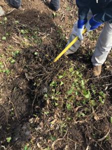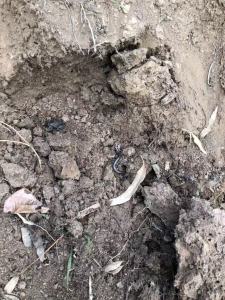 The second week, we have activities near the first place under the Mount Majura Nature Reserve. The project purpose was protected the frog’s habitat. This drainage ditch have two sections. Just one side had some frogs. Firstly, we remove English Ivy on the dry area. This picture shows that most area was occupied. (Figure 2) Seriously affected the habitat of the frog. The population of frogs was reduced and they are not happy in there. The roots of this plant are deep in the soil. It is hard to remove takes a lot of energy. As we cleared the roots, we found young frogs and lizards hiding in the mud and transferring them to the place where there was tall sedge. (Figure 3) And planted more tall sedge Carex appressa on both sides of the drain. There had about one meter for every plant.( Figure 4)