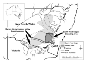 Map showing distribution of superb parrot and key breeding areas (Credit to Manning et al, 2004)