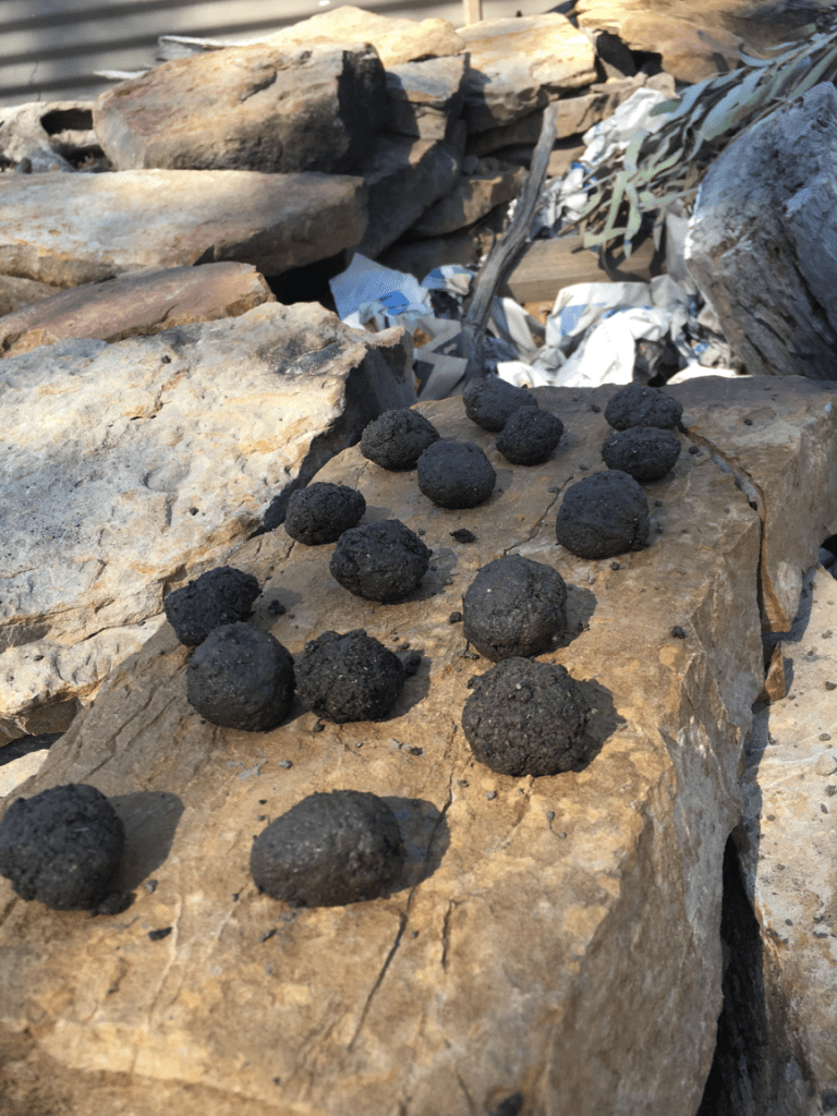 Seed balls made of clay air drying, in preparation to be cast throughout regeneration areas at Perrumba.