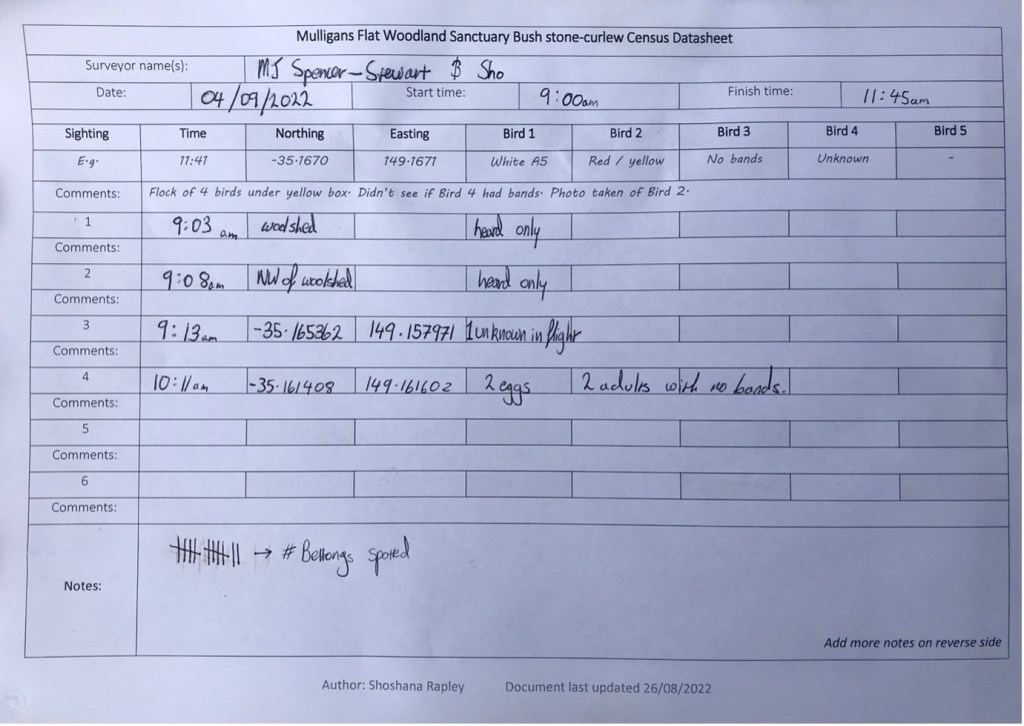 Volunteering for the lovely Sho Rapley’s PhD research on Bush Stone-Curlew reintroduction, I helped conduct a population survey at Mulligan’s Flat Woodland Sanctuary (MFWS). The unique 1253 ha of wildlife habitat enclosed by a 23km predator-proof fence is the secret to the curlews’ survival. First reintroduced to the predator-free sanctuary in 2014, with a total of 6 group releases to date. The reintroduction of the curlew to MFWS historically marked the return of the species to the ACT.